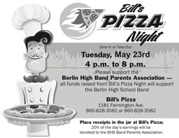 Please support the Band, by participating in the fundraiser at Bill’s Pizza on May 23, 2017 from 4pm to 8pm. (Remember to place receipts in the jar at Bill’s Pizza.)